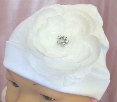 Soft, cotton baby hat featuring a 3.5" silk and organza flower. The flower sparkles with rhinestones in the center. This hat is available in many colors and fits ages newborn-9 months.