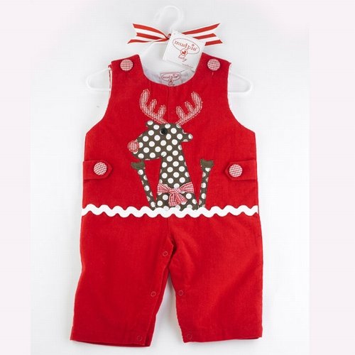 - Red corduroy overalls with a reindeer appliqued on the front