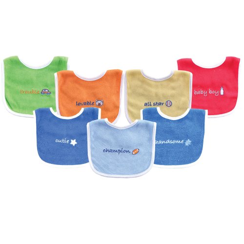 Luvable Friends 7-Pack Fun Embroidered Sayings are a great value pack that will help protect your baby's clothing from drool and spills. Available in 2 theme choices with embroidered sayings and a picot trim. Blue Theme - champion, cutie, handsome, trouble, lovable, all star, baby boy| Pink Theme -princess, sweetheart, beautiful, cutie, adorable, lovable, baby girl.