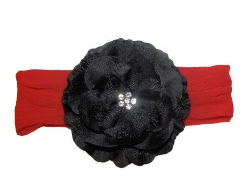 This beautiful red headband and black flower set is a must have. The headband comes in 3 sizes fitting baby through about age 10. The headband is a soft and stretchy nylon allowing for sizing and a comfortable fit. The headband has a small grosgrain ribbon pocket for clipping on the flower or other accessories. This black flower is full layered and is adorned with 5 small jewels. The flower is attached to a strong single prong pinch clip. This set is adorable.