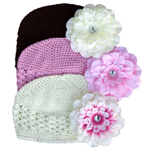 These adorable hats by Headbandz iare crocheted with soft cotton and elastic and comes with a detachable rhinestone flower (4.25 inches in diameter). These stretchy hats add style and comfort to a baby's wardrobe.